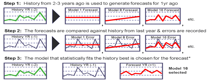 Before applying a ‘Best-Fit’ selection process over a given time horizon, GAINS first determines what type(s) of demand pattern(s) are applicable and then eliminates models that show statistical characteristics such as bias or volatility