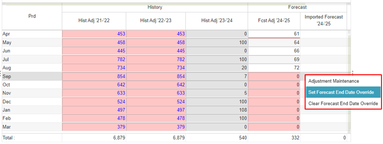The History Begin Date Override function in GAINS allows Users to remove historical values from consideration for forecasts. This option can be accessed by right clicking on the monthly bucket you want to start the process from and selecting "Set History Begin Date Override". All monthly buckets prior to the one the User selected will now be ignored for Forecast calculations. Users can right click the cells highlighted in red and select "Clear History Begin Date Override". Forecast End Date Overrides set a date after which GAINS will apply a zero-forecast